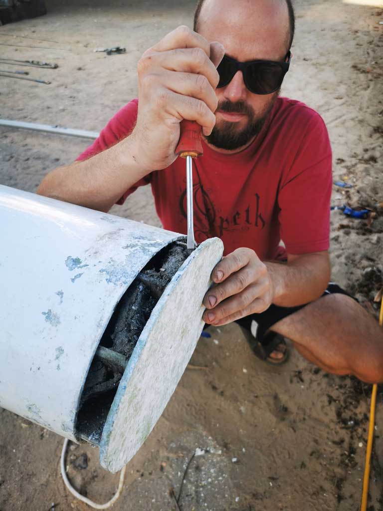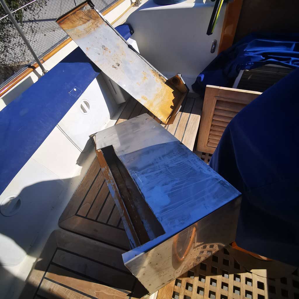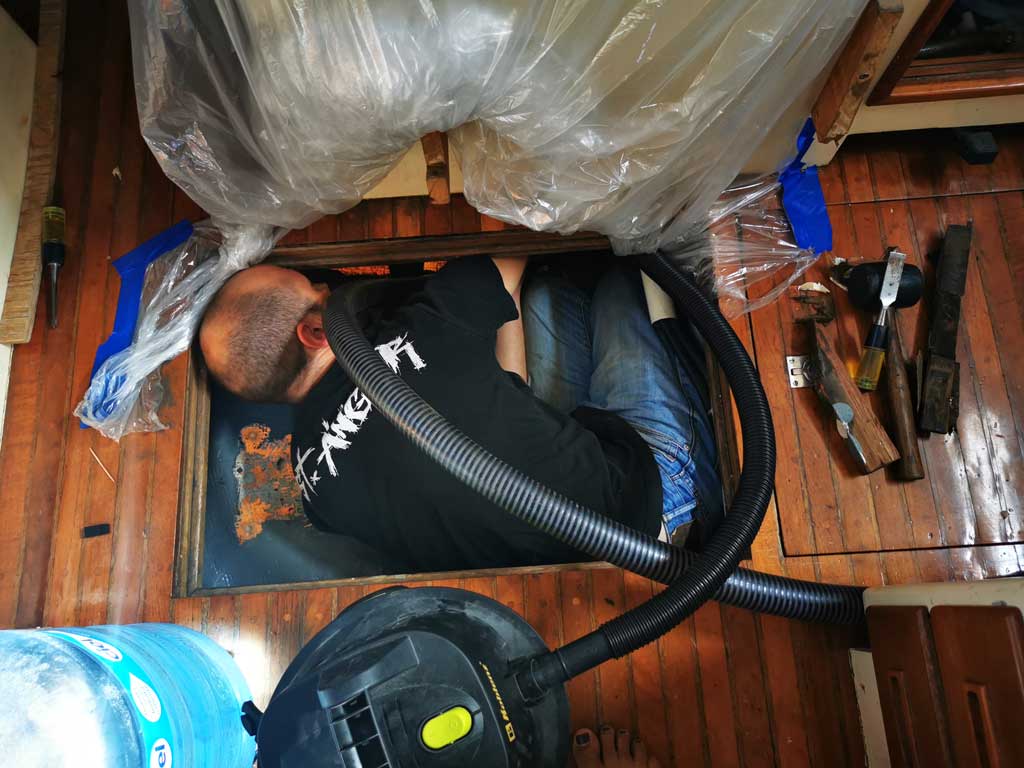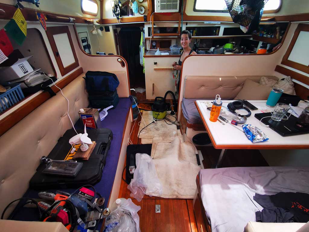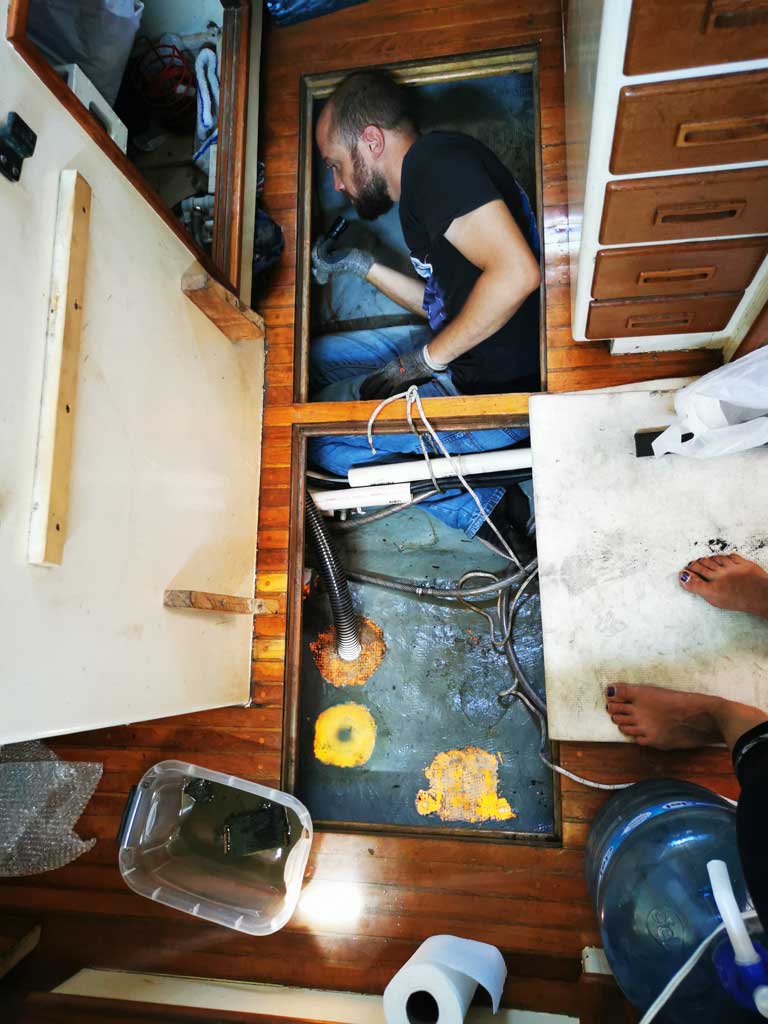 Eines Morgens herrschte plötzlich mal wieder emsiges Treiben auf Milagros. David verkroch sich mal wieder in der Bilge. Scheint sein Lieblingsort auf dem Schiff zu sein. Auch finde die Bilge spannend. Darin verschwinde ich manchmal und untersuche die hintersten Ecken. Er aber wird von Pati in Plastik eingepackt, ich helfe dabei. Dann schneidet er mit der Trennscheibe am verbleibenden Wassertank herum. Einer ist ja schon raus, nun ist der zweite dran. Scheint wahnsinnig Spass zu machen. Er will sein Schiff verkaufen. Geht aber nicht, weil es in seine Einzelteile zerlegt ist. Hätte er sich vorher überlegen müssen. Trotzdem schafft er es, über seinen Schatten zu springen und die alten Wassertanks sind wenig später Geschichte.