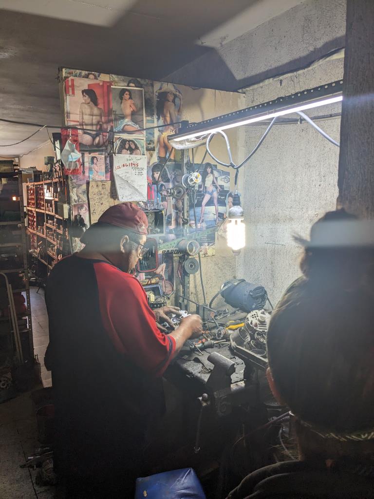 Als wir mit unserem neuen Alternator in der Werkstatt unseres Vertrauens ankamen, hatten wir das Gefühl, dass der Mechaniker unsere Anweisungen tatsächlich verstanden hatte. Wir durften ihm bei den Anpassungen sogar über die Schulter schauen. Ein junger Mitarbeiter fuhr vor Schreck zusammen als plötzlich unbekannte Gesichter hinter der Theke auftauchten. In Mexiko heisst das leider zu oft "Überfall" und bei ihm schrillten schon die Alarmglocken. Sorry dafür! Kurz darauf machte sich der Chef ans Werk. Man beachte die Poster an der Wand im Hintergrund. So gehört sich das doch für eine echte Werkstatt, oder nicht?