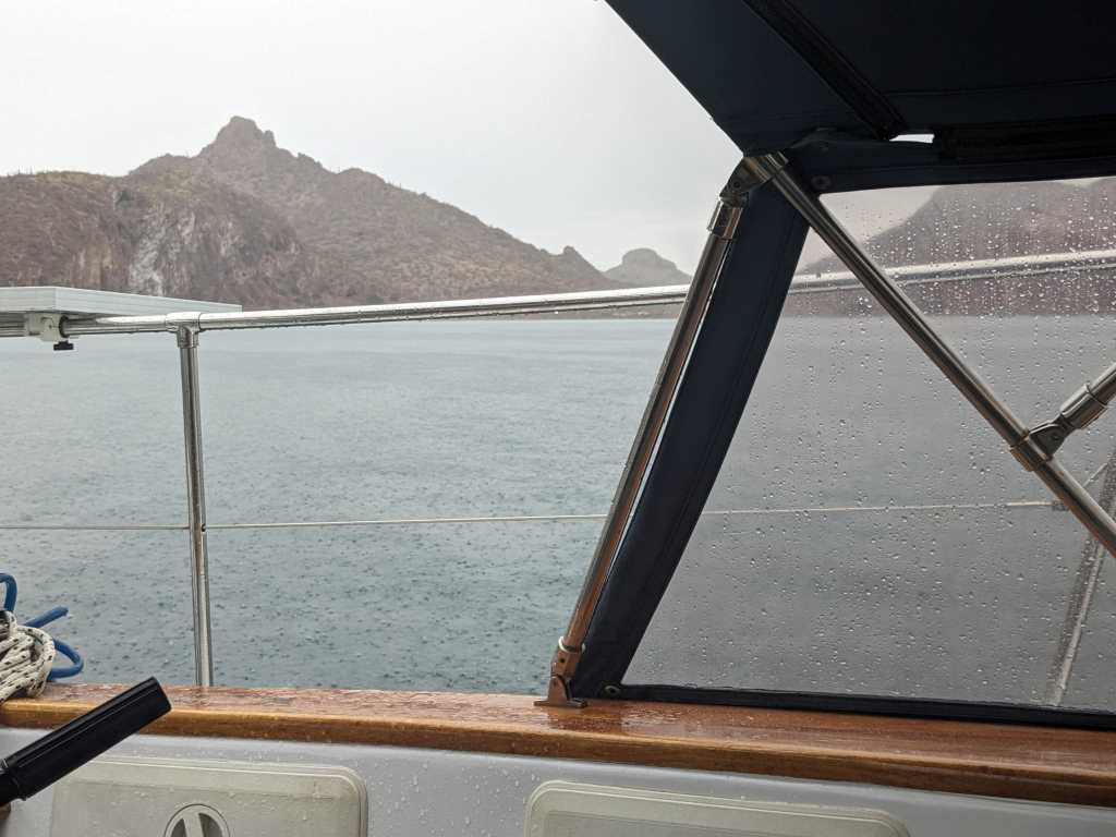 Was unsere Laune aber ein bisschen hob, war ein rares Wetterphänomen: Regen! Es war schon den ganzen Morgen lang bewölkt, aber als der Regen startete, hörte er einfach nicht mehr auf. Eine Stunde lang regnete es. Du wunderst dich jetzt vielleicht, weshalb Regen unsere Laune hob. Weil es hier nie regnet. Oder wenn es einmal regnet, dann nur ein paar Tropfen. So sassen wir im Cockpit und genossen diesen wundervollen Moment.