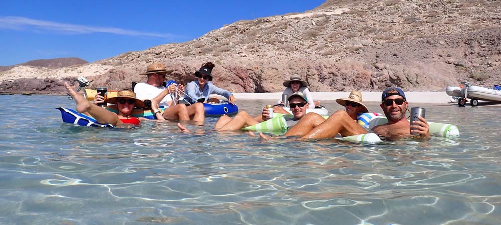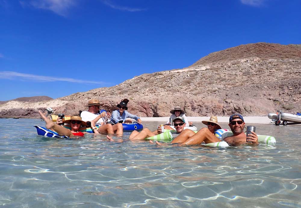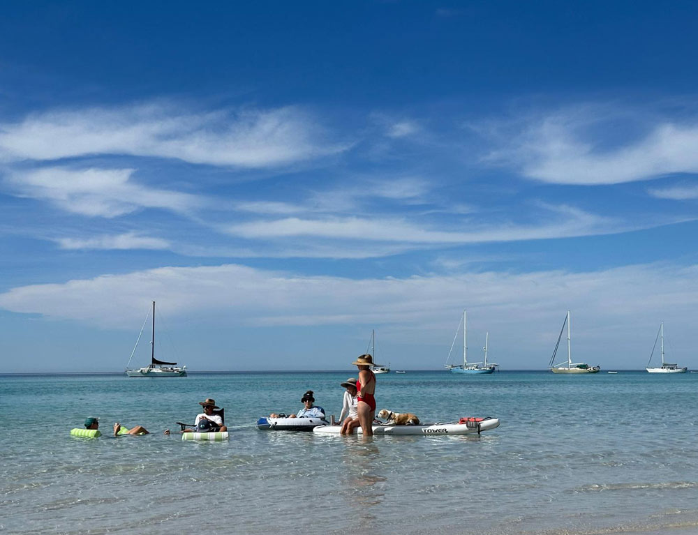 Es ging langsam aber sicher Richtung Sommer, und es wurde wärmer und wärmer. Auch die Wassertemperatur war inzwischen richtig angenehm. Die „Floating-Saison“ hatte begonnen. Um richtig zu „floaten“, braucht es eigentlich nicht viel. Ein Sonnendach am Strand, Schwimmutensilien wie Paddleboards, Schwimmringe oder Sitzmatten, einen Hut auf dem Kopf und ein Bier in der Hand. So vergingen die Stunden im Handumdrehen, und wir waren immer gut gekühlt und hydriert. Zu guter Letzt trafen auch noch Kim auf SV Salt und Randy und Jody auf SV Free Luff zu unserer Gruppe hinzu. Nun waren wir eine Gruppe von stattlichen sieben Schiffen und ein bunter Mix aus Einrumpf-Schiffen, einem Katamaran und einem Trimaran.