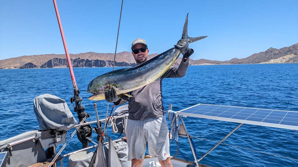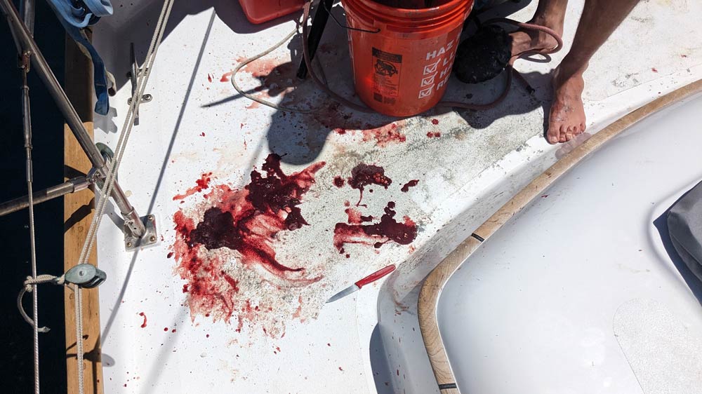 Und mein Anglerglück ging weiter! Wir waren kaum in Las Salinas aufgebrochen, da fing ich einen riesigen Mahi-Mahi (Goldmakrele). Mahi-Mahis sind etwas vom Besten, das in den Weltmeeren herumschwimmt, und in den Sommermonaten zu Tausenden in der Sea of Cortez unterwegs. Nach dem Filetieren hatten wir 3,5 kg Mahi-Fleisch im Tiefkühler. Yesssssss. Wieviel Arbeit es ist, einen Fisch auf einem Segelschiff zu fangen, kann man den Bildern entnehmen. Wir sollten bis zum Ende der Saison noch Schuppen, Blutflecken und andere Überbleibsel von dem Koloss auf dem Deck finden.