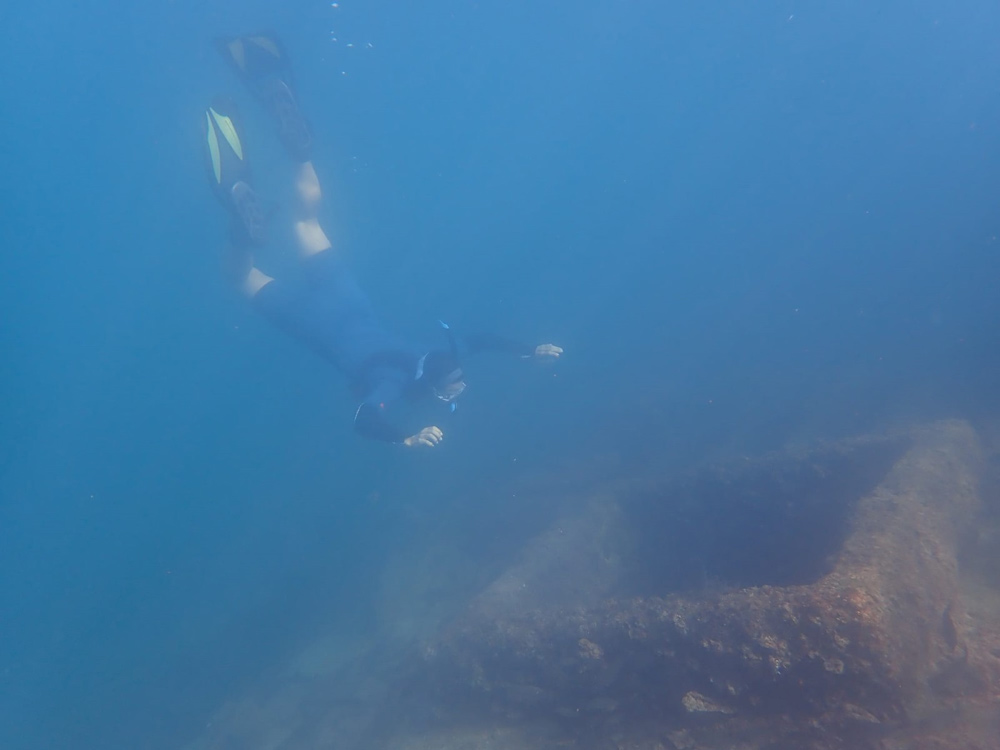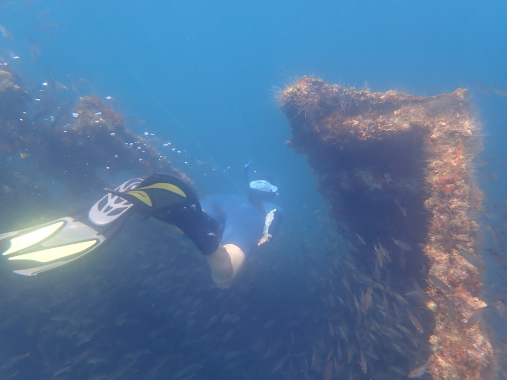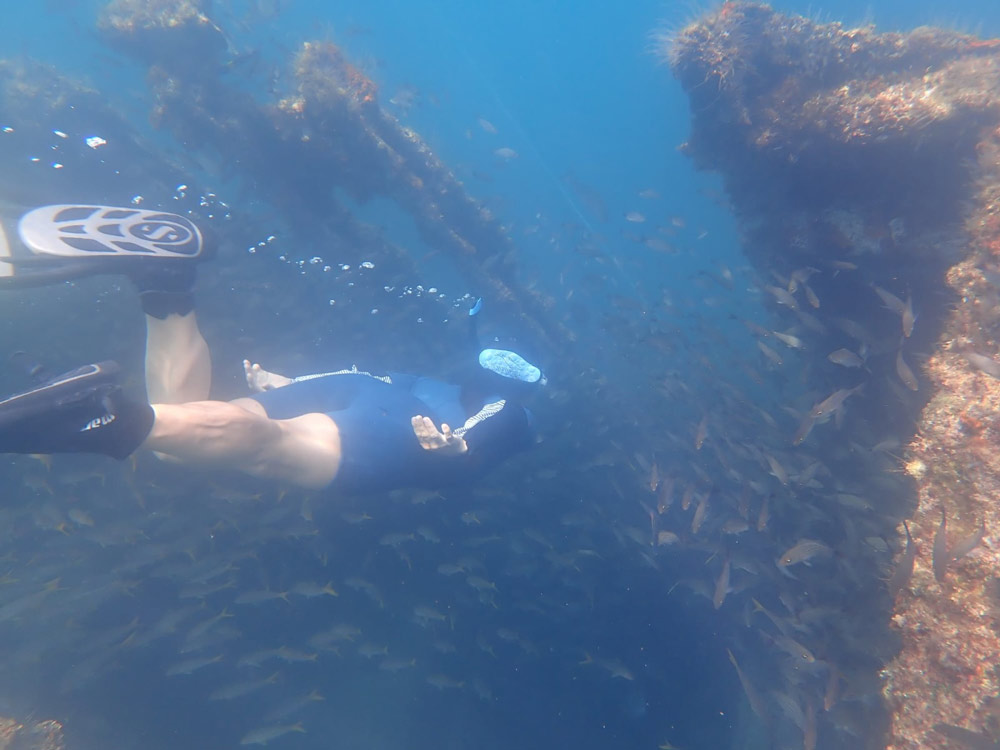 Uns wurde ein paar Mal erzählt, wie toll das Schnorcheln bei ebendiesem Wrack war. Wir wollten uns das selbst mal anschauen. Wir machten unser Dinghy an der mexikanischen Markierungsboje fest: Einem weissen Kanister, haha. Wir sprangen ins Wasser und waren sofort überwältig von der Menge an Fischen, die sich dort tummelten. Wenn man runter getaucht ist, machten die Fische Platz und man konnte durch die verschiedenen Schwärme tauchen. Man spürte sogar, wie es kälter wurde, wenn sich die Lücke im Schwarm über einem schloss und das Sonnenlicht blockiert wurde. Ganz mutig trauten wir uns dann schlussendlich noch, durch das Wrack zu tauchen. An einer ganz einfachen Stelle, aber wir sind durchgetaucht. Es war auch spannend zu sehen, wie die verschiedenen Schwärme quasi aufgeschichtet waren. Oben die kleinen Fischarten, unten drunter die etwas grösseren und ganz unten die ganz grossen, die man nur sah, wenn sich die oben drüber teilten. Eine richtig coole Erfahrung.
